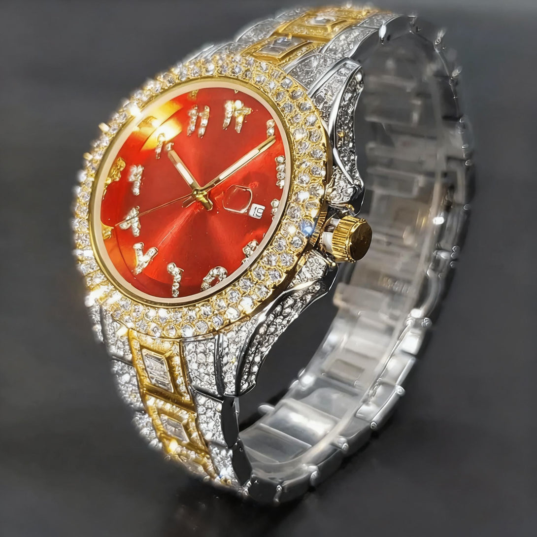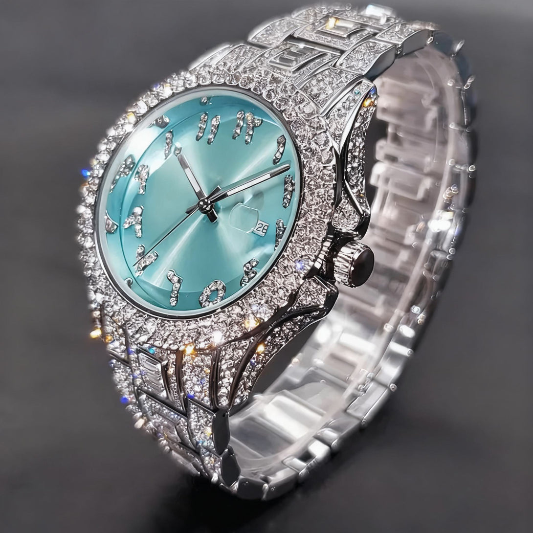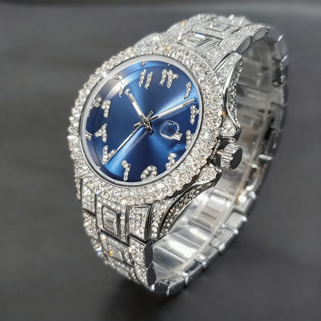 The Presidential Arabic Dial Iced Out Watch commands authority with cultural elegance and uncompromising luxury. Set with brilliant diamonds that blaze with relentless fire, its striking Arabic numerals pay homage to heritage while radiating modern power. Designed for leaders who shape the future without forgetting the past, this timepiece transforms every moment into a statement of prestige, influence, and refined global ambition.