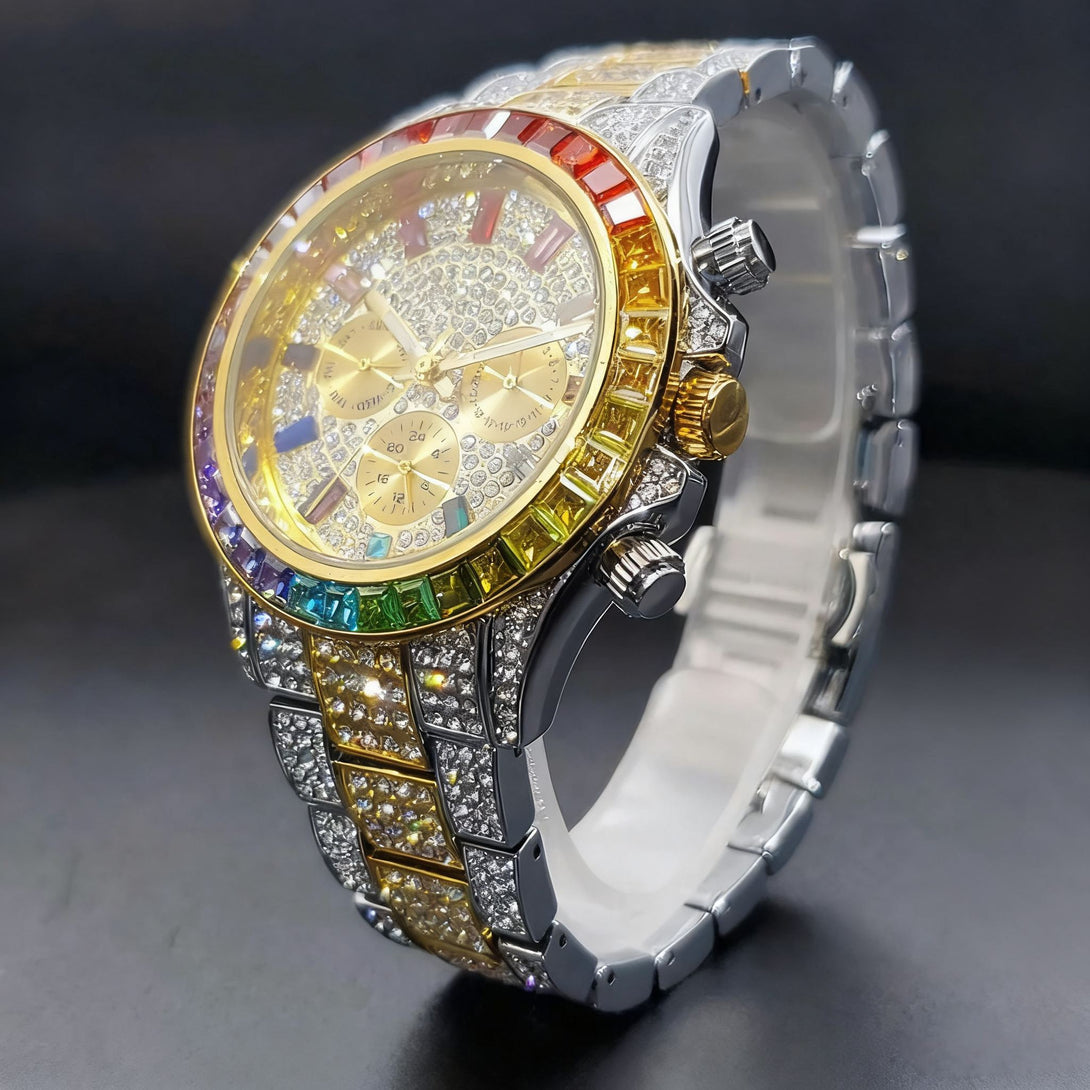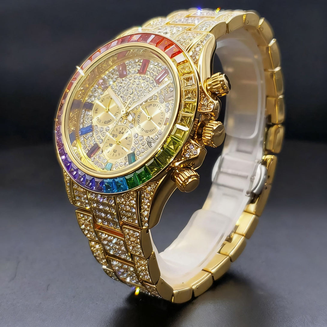 Where time transforms into treasure. The Tempus Iced Out Watch redefines luxury chronometry through a seamless fusion of classical elegance and uncompromising diamond brilliance. Meticulously crafted for those who understand that true prestige is measured in both moments and magnificence, this timepiece transcends functionality to become a wearable legacy. Its fully iced-out surfaces capture light like frozen fragments of eternity, offering a constant reminder that for the discerning few, every second should sparkle with significance.