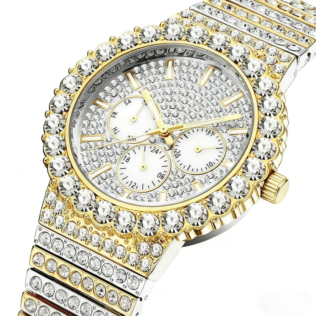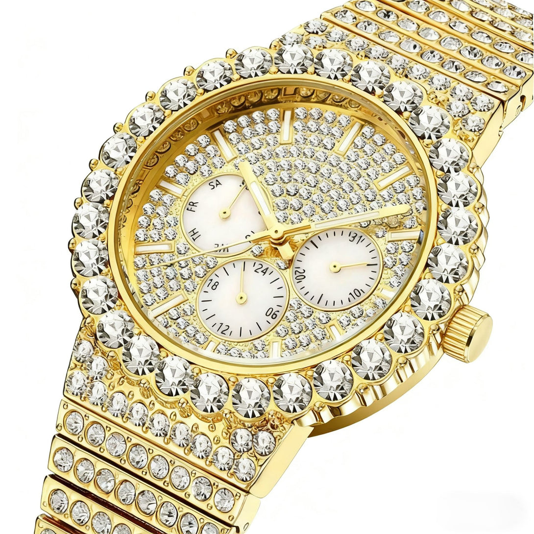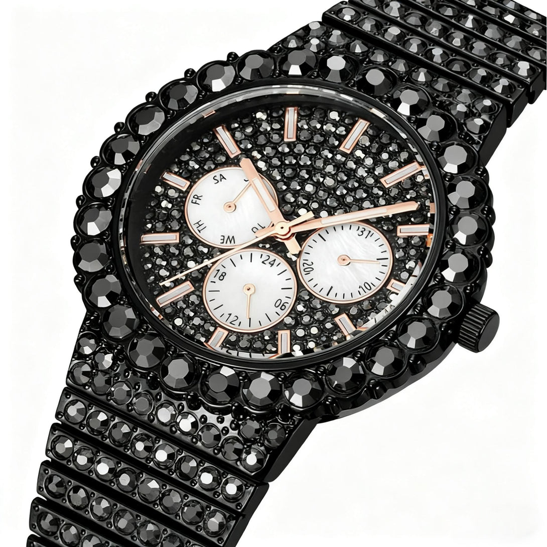 Where the cosmos meets the wrist. The Celestial Iced Out Watch captures the infinite radiance of the stars in a masterpiece of diamond-set luxury. Each meticulously placed stone mirrors the brilliance of a distant galaxy, transforming timekeeping into an celestial experience. Designed for those who draw inspiration from the heavens, this timepiece blends astronomical wonder with uncompromised opulence—offering a constant reminder that true elegance is both timeless and universal.