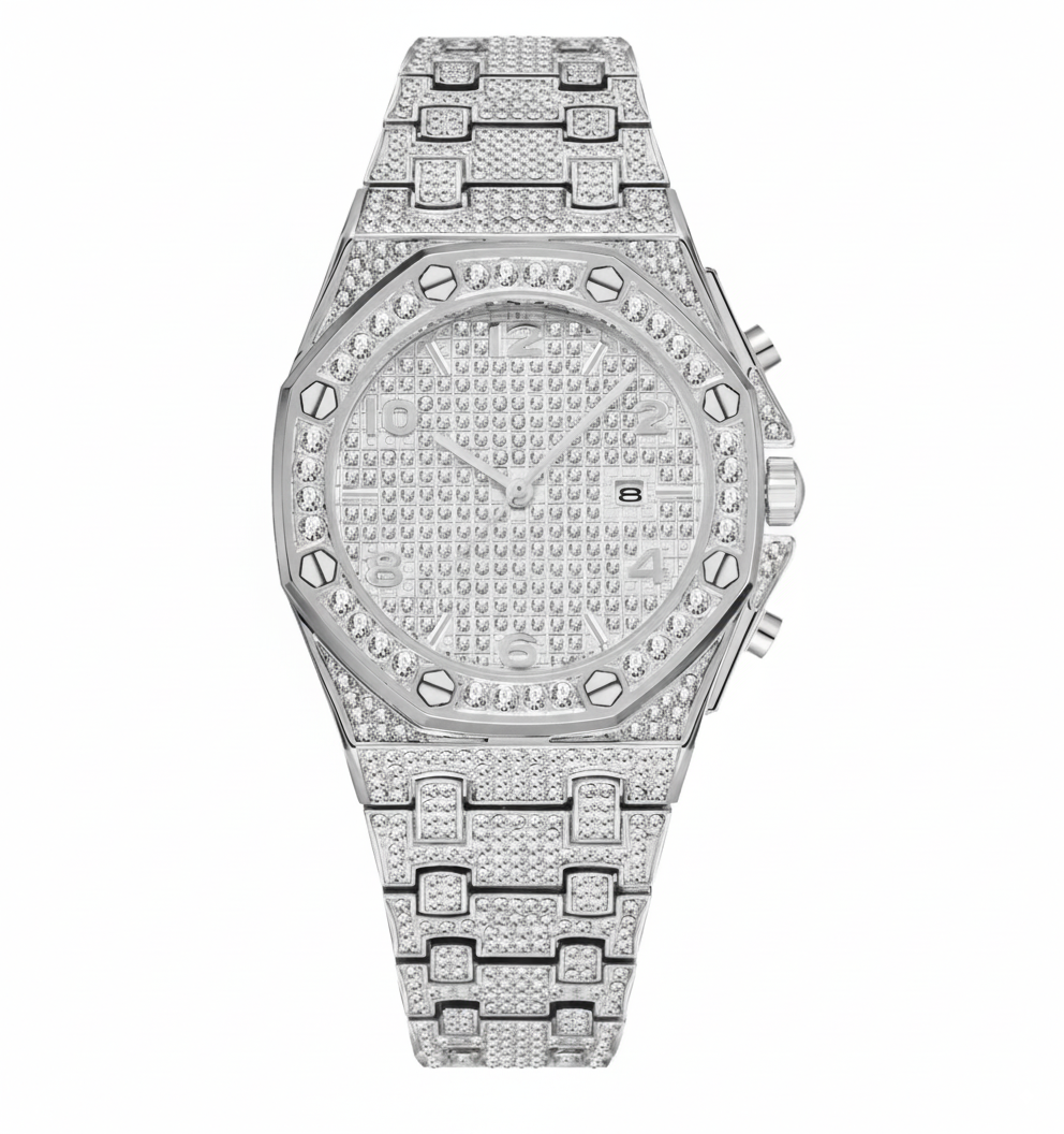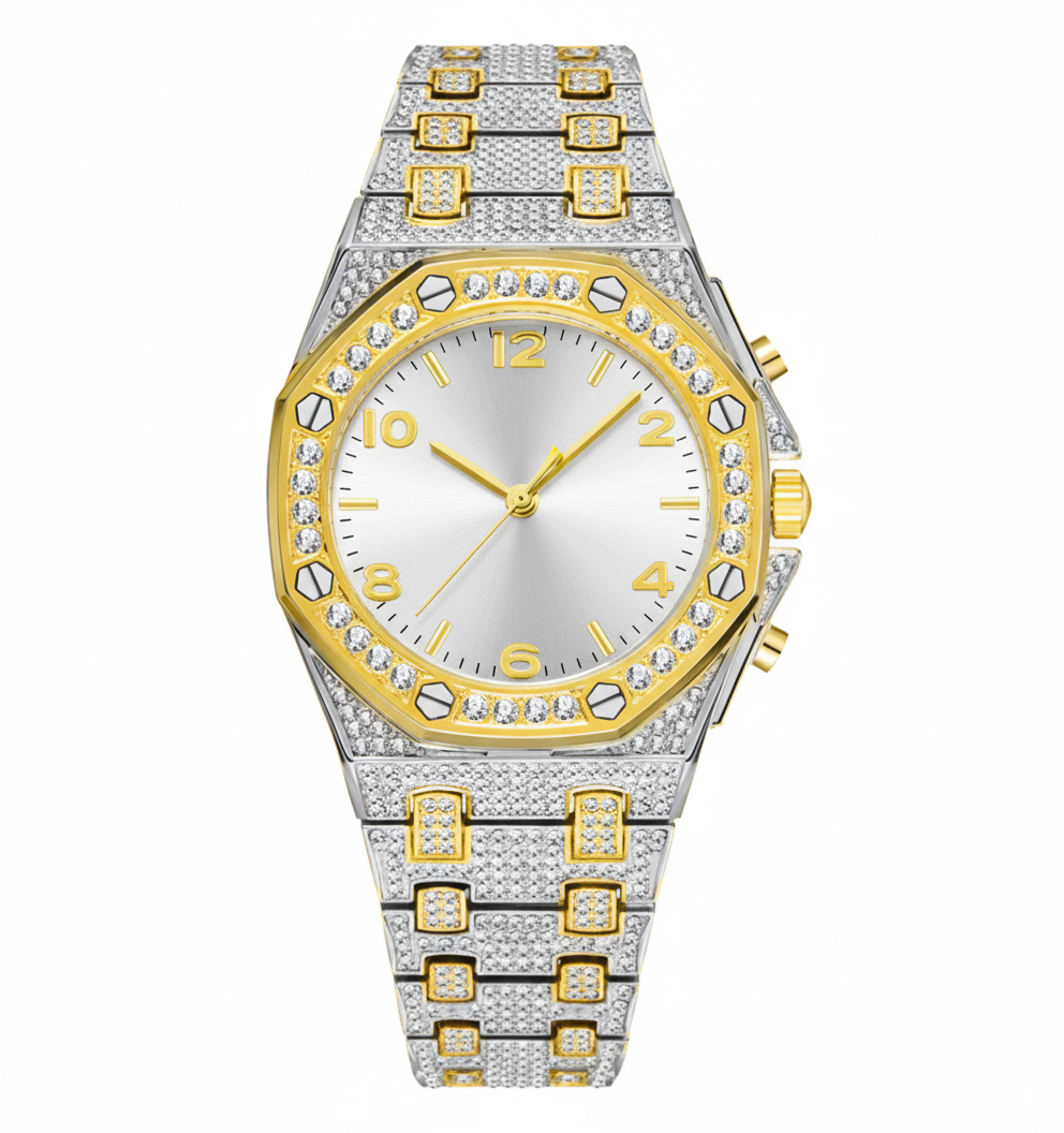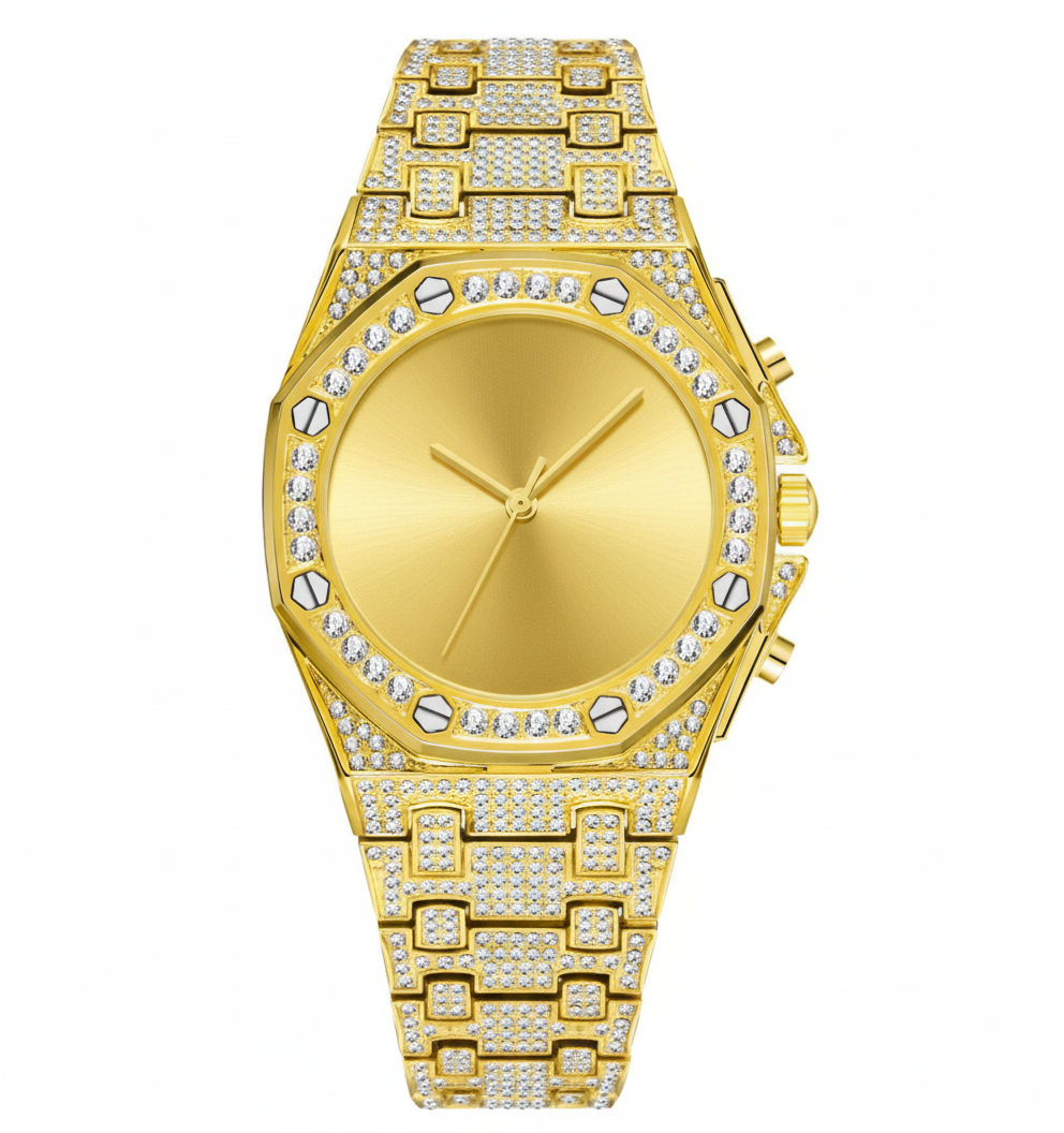 Pharaoh-level ice. The Luxor drips with pyramid-cut diamonds, gleaming like ancient power on your wrist. This ain’t just a watch—it’s a treasure. For rulers who command respect and redefine luxury. Gold finish, flawless stones, unstoppable presence. Own your throne.