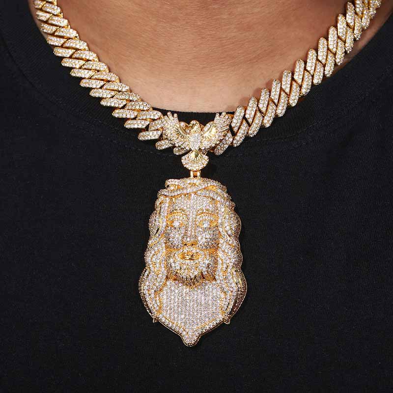 The Moissanite Eagle Buckle Jesus Pendant showcases a bold and divine design, blending spiritual symbolism with striking craftsmanship. At its center, the detailed face of Jesus is framed by a powerful eagle motif, wings outstretched as if in protection and glory. Intricate detailing across the pendant highlights the strength and grace of both figures, creating a captivating visual statement. Designed to command attention, this pendant embodies faith, freedom, and fearless expression in a single, unforgettable piece.