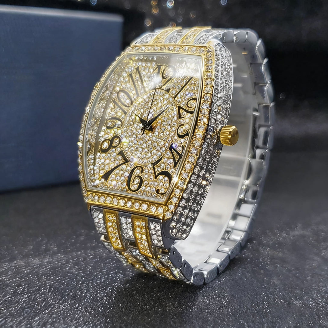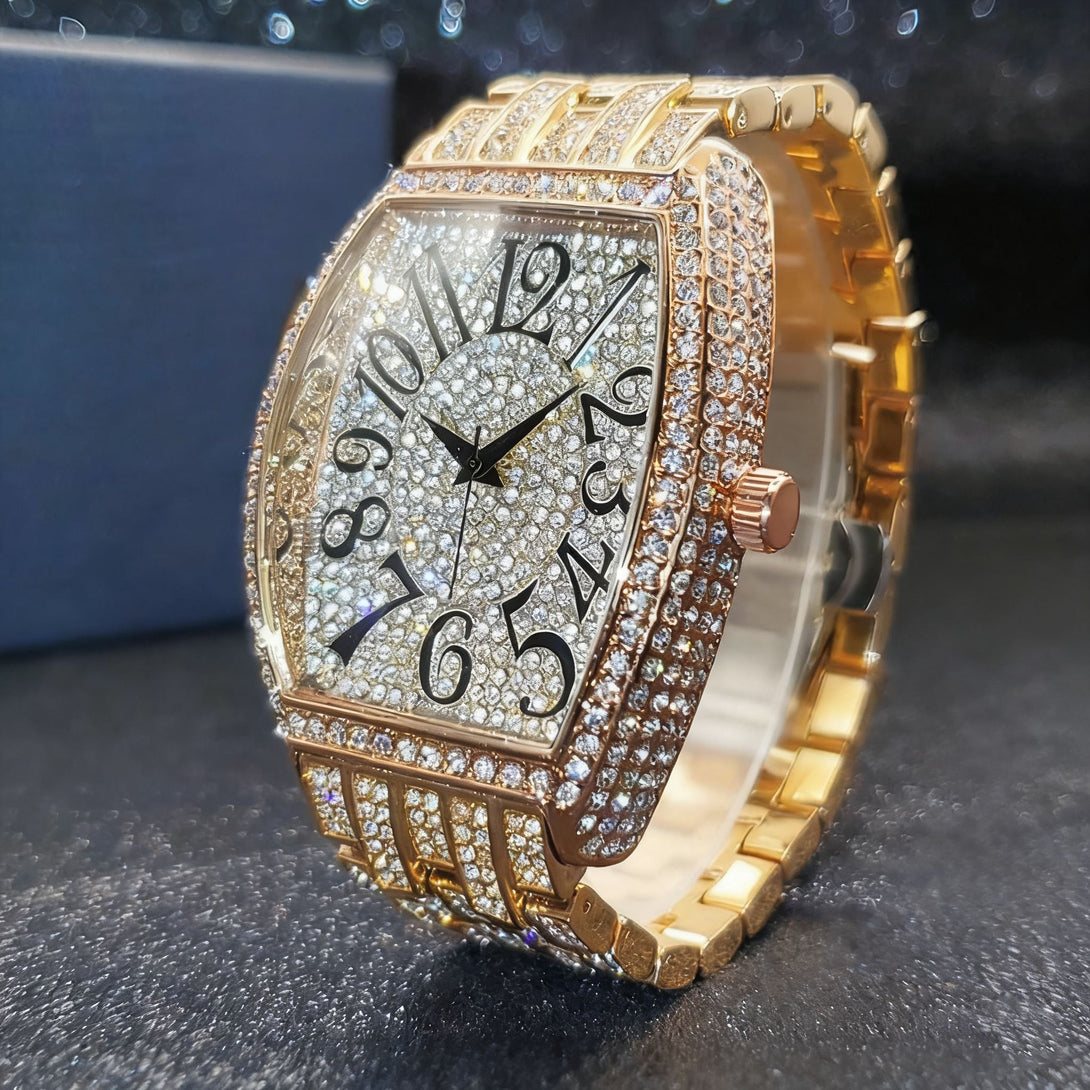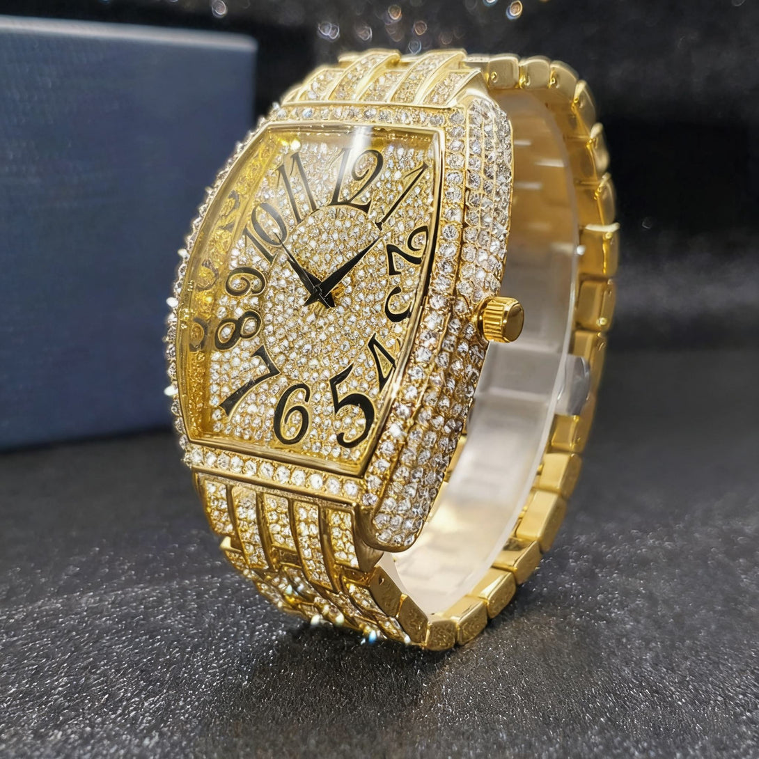Elegance shaped by light. The Navette Gold Iced Out Watch redefines luxury with its distinctive shuttle-shaped case, crafted in radiant gold and adorned with a cascade of brilliant diamonds. Seamlessly blending vintage inspiration with contemporary opulence, this timepiece captures attention through its unique silhouette and uncompromising sparkle. Designed for those who appreciate heritage details and bold modern statements, it offers a wearable masterpiece where geometry meets grandeur, and every angle tells a story of refined taste.