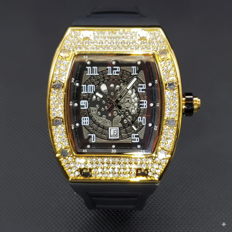 The Vertex Iced Out Watch defines the peak of luxury, where geometry meets grandeur. Each facet of its boldly sculpted design is iced with flawless diamonds, creating a spectacle of light that commands absolute attention. Built for those who stand at the summit of style and success, this timepiece transforms the wrist into a symbol of sharp ambition and undeniable opulence. More than an accessory—it's the ultimate vertex of power and prestige.